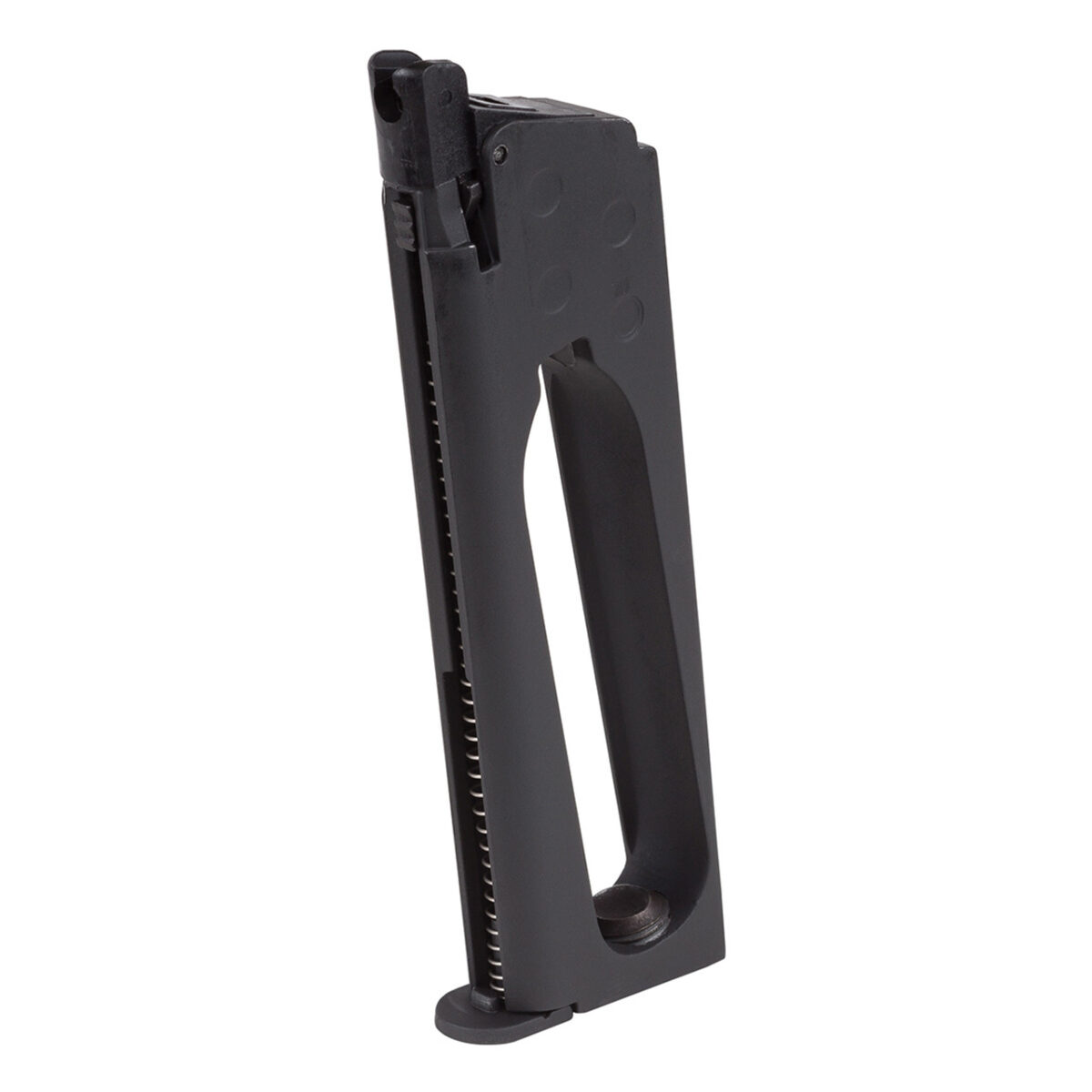 This full-metal, CO2-powered, semi-automatic BB gun can send 18 shots downrange as fast as you can pull the trigger at velocities of up to 320 FPS. It’s powered by one 12-gram CO2 cartridge – housed in the drop-free, metal magazine – and gets about 65 shots per fill. It produces a realistic kick when discharged. And, once the last shot in the mag leaves the barrel, the slide locks back, just like a real-steel 1911.