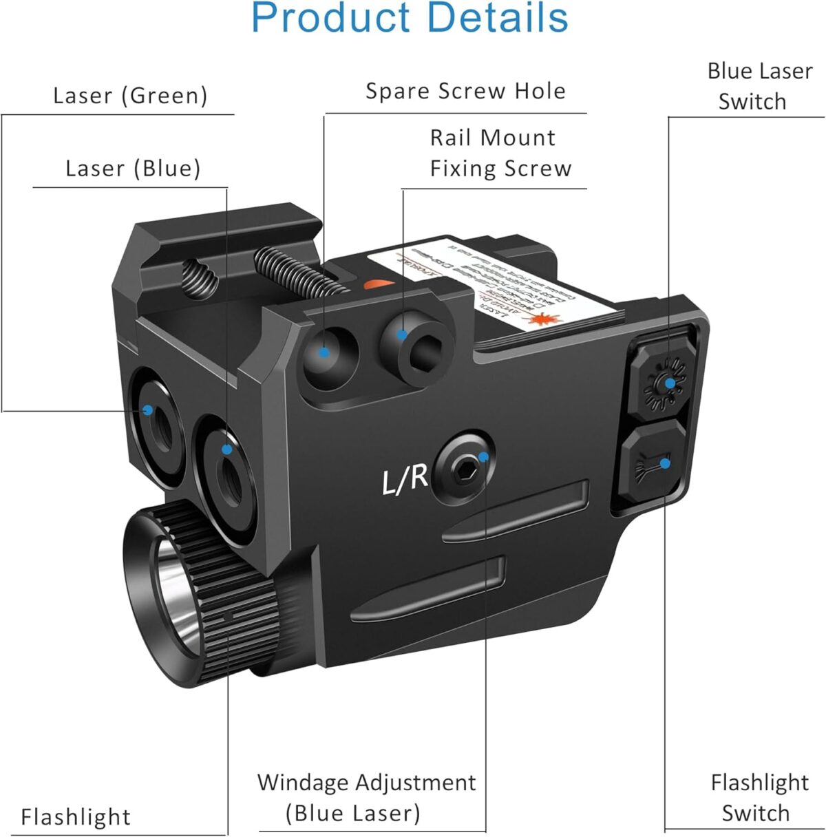 (9) Lighting mode: red laser,green laser,laser+flishlight,strong light, flash