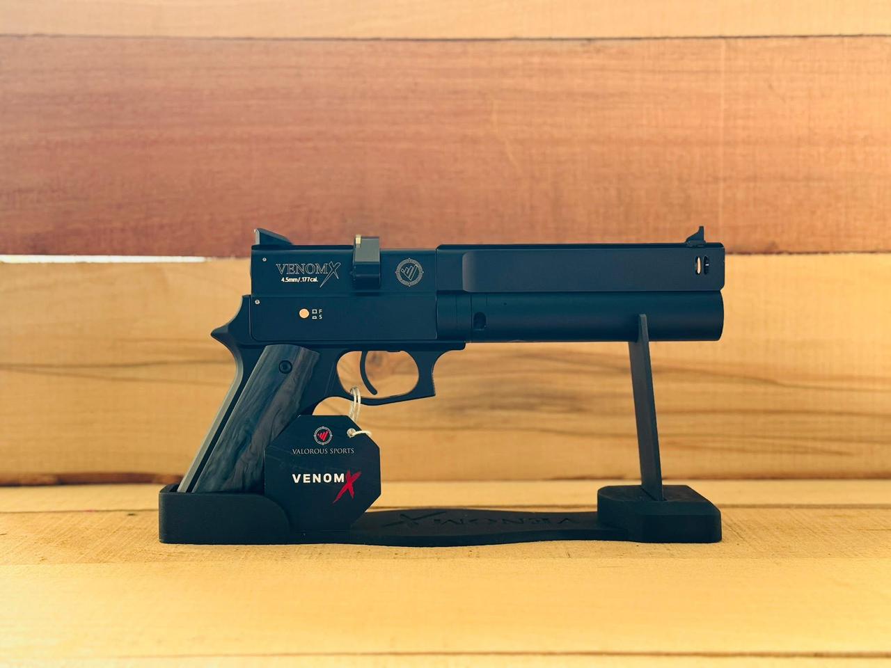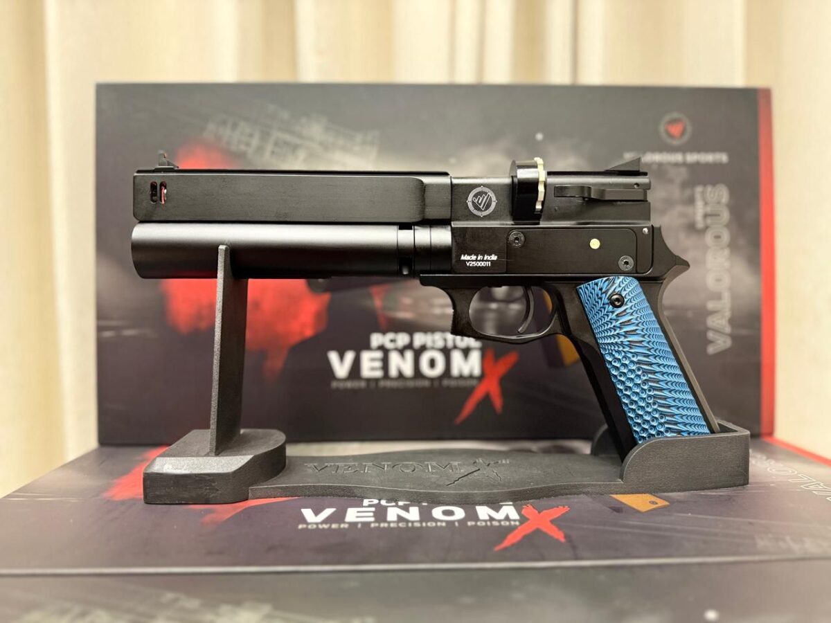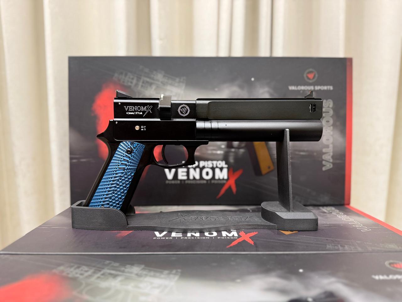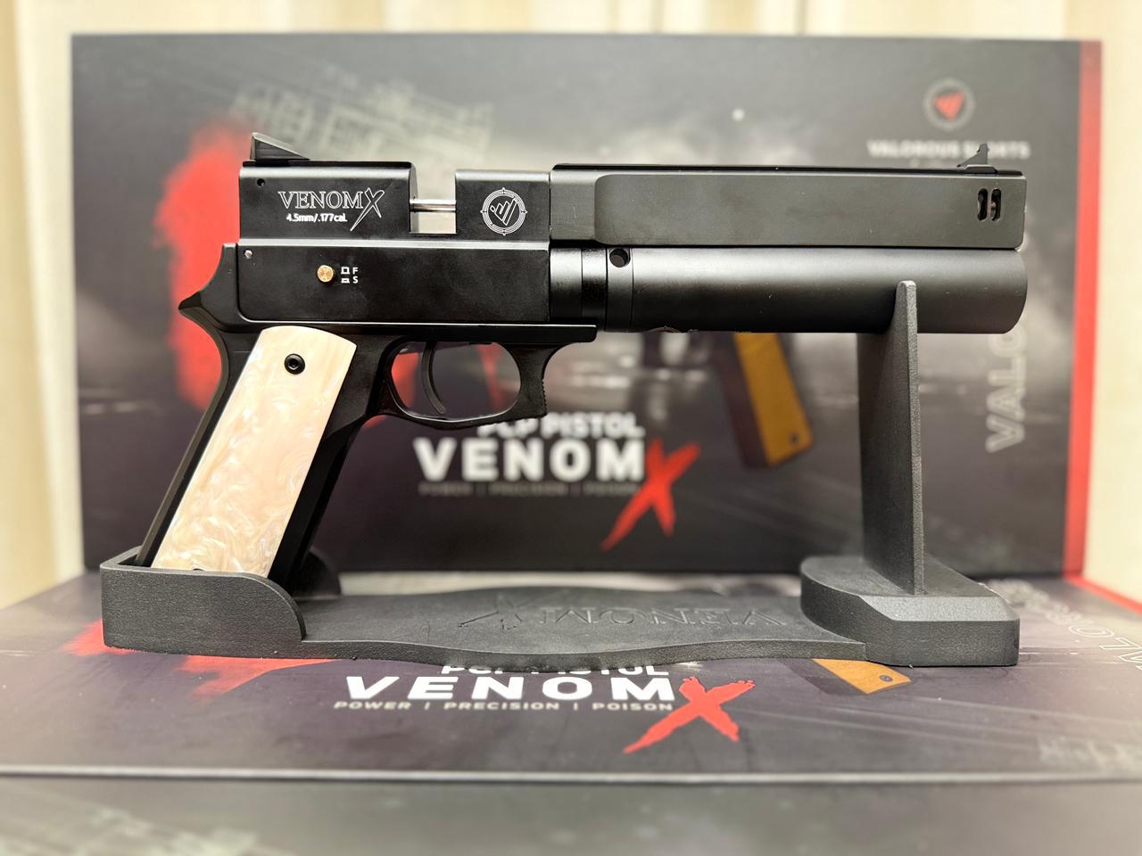 Venom-X is a Pre-charged pneumatic (PCP) air pistol manufactured by the Indian company Valorous Sports Pvt Ltd. It is chambered in the .177 caliber and was announced for launch in 2025. The pistol is intended for target shooting and Plinking and does not require a license in India.